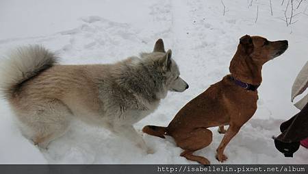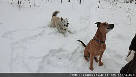 又碰到大黃狗「背書」和牠主人,今天多加了一隻毛髮蓬鬆,塊頭更大的Husky(不見主人),看牠們在雪地中互相追逐郖耍得不亦樂乎,尤其是那隻Husky,簡直像是如魚得水般的高興,跑的兩隻狗腸胃懦動一致,同時各自劃地大號,看的我哈哈大笑!和她們分道揚鑣後,Husky還特意回跑來,溫馨無言的望著我一、兩秒,以示道別(自個兒貼金),真是可愛!每次看到狗誠摯的臉樣,都會令我打心底喜樂起來,直慶幸,還好沒因下著小雪而放棄走路!