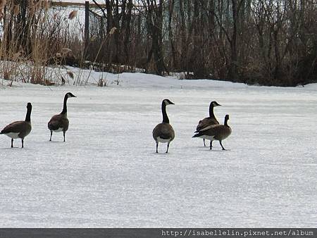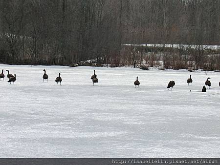 大雁(Canadian Geese)開始回飛,昨兒碰到一小群,牠們似乎想找水塘歇歇腳,可憐池水面尚是凍冰,繞了幾圈,還是降下停駐了一會,又再度飛起另覓水源去了,附近就有河流,倒也安的很!