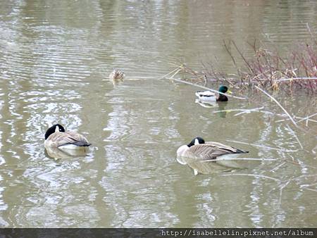 日前,見一隻大黑狗跑來河邊,吼追一群鴨子,使其驚慌地游離岸邊,就看到兩隻大雁突然從隱密處游出,或許是被擾了清幽,對著黑狗猛一陣刮叫訓斥,嚇的狗掉頭就跑走了,看得我好笑!之後,這兩隻大雁又優游地一邊小憩去了;