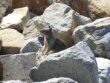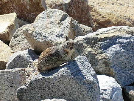 在La Jolla的海邊石堆中,見到了這隻ground squirrel(地松鼠),毛色斑紋活潑有趣,比我這兒的樹松鼠的毛色可愛些!
