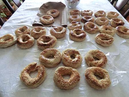 這次帶了兩打Bagel回台,需先放到涼,再冷凍裝箱,攤在桌上,似乎成了小賣商了!海關人員看的都發笑!不巧被抽驗到要查行李,懷疑是因我到機場太早,美國海關樂得乘機盡忠職守一番,翻箱倒櫃的詢問,帶給老姊的牡丹花子被翻出,我自己都忘了,好在沒被罰款,被告知可罰款金額可高達cdn$300.00,但因只是過境美國,而非入境美國,所以放了我一馬,希望不要上了他們的黑名單才好!