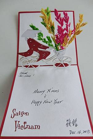 去年12/16從會安(越南)以航空寄回家(蒙特婁)的這張賀卡,回來後,女兒告知,隔年的二月中旬才收到!走了近兩個月,這算是哪門子的航空信啊!一點都不信實,真糟糕!