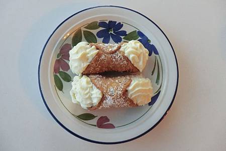 發掘了一種義大利西西里人特愛的甜點「Cannoli(香炸奶酪捲)」,外殼炸過,中間包著Ricotta cheese加cream作成的填充餡,醇厚清爽,非常好吃!