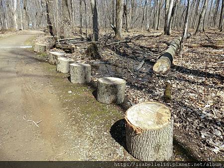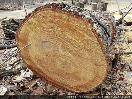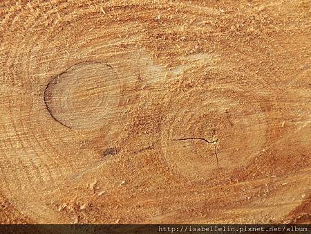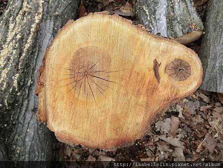 林中整伐 (修)的樹幹,大都是留置原地化成自然肥,偶會見著些有趣的樹紋,如這雙圈輪,說是側枝嵌入所致!