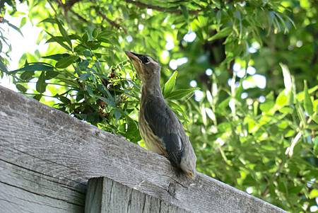 這隻鳥兒在後院欄籬上,一動不動地,走進跟前,還是不飛,不知是羽毛未豐,還是受傷,一臉的驚恐無奈!