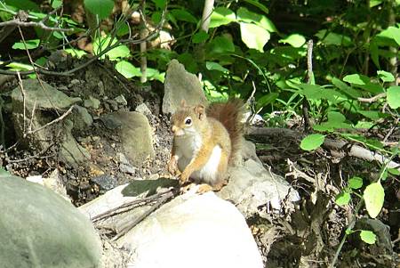 這隻小松鼠在人跡稀少的小徑,訝異突見一人,一臉疑惑,舉足不定,後還是選擇了離開!