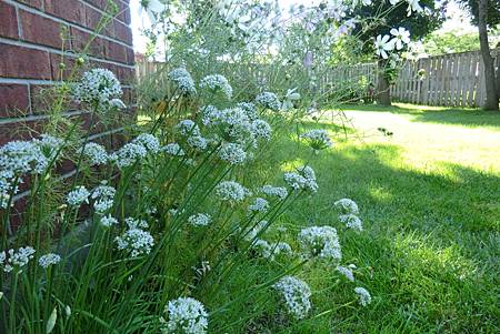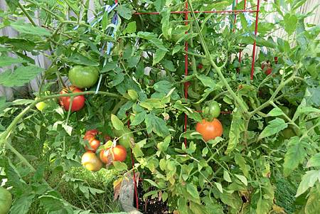 園中三棵番茄終於開始收成了,加上一盆羅勒(basil)、一小撮韭菜(過老已開花了) 、營養不良的梨,似乎也挺樂鬧地!