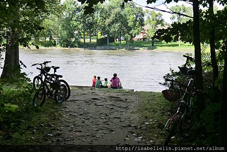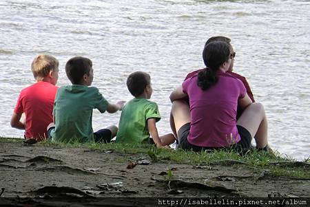 能看得出這位母親細膩的心思嗎?父母加上三個小男孩,五件ㄒ恤顏色各雖不同,確十分搭配,三部腳踏車,一步二人協力車,騎至河邊,坐看往來風光,一派溫馨!不忍心打擾他們,遠遠地捕捉下這一畫面,轉頭走人!想,孩子們的簡單喜樂是純真的,安寧平和的家庭孕育出安寧平和的孩子,是幸福!