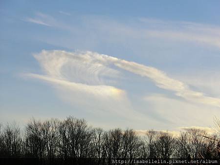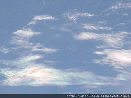 「前幾天還在說,沒見過大片的[彩雲],昨兒走路時居然也見著了,看似沒CY的那片厚實壯觀,但也是整片,雖十多分鐘就煙消雲散,但那短暫的榮耀,那柔美的色澤,已足夠令人感讚的無語淚流!(適巧沒帶相機,怕也照不岀,太亮了,下午3時許, 艷陽高照.) 」