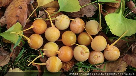 10/24再去時,雖非全然一色黃,但轉換中的黃綠,也饒富趣味,蝴蝶葉片橘金菓,天雖灰濛,確蓋不住那飛揚的喜悅!菓子聞似有股木瓜味,女兒說是臭起司(cheese)味,教友們聞不出像啥,說就是銀杏菓味,哈!打馬虎眼了!