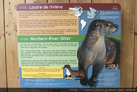 10/27到附近(約15公里單程)一處野生動物庇護所(The Ecomuseum Zoo)晃了大半天,該地主要是為收養動物孤兒或是讓受傷動物療養的場所,也提供給小學生課外學習用,佔地很小,動物不多,但也看到一些不易見的動物,如白狐(Arctic Fox)、山貓(Lynx) 、黑熊、土狼(Coyote) 、美洲貂(American Marten) 、漁貂(Fisher)…等等,唯一可惜的是沒見到原本有的灰狼(Grey Wolf) ,說近期會有兩隻到來;這其中對水獺和山貓最為驚喜,來瞧瞧: