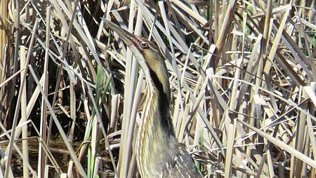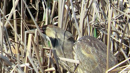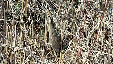 才說要「尋牠枯黃間」呢,日前(05/04)一個意念,岔到一原不想去的角落(非第一次見著之處),正走著,聽到枯草間有移動聲,循聲望去,喲!一隻憨憨的American Bittern,這下可盯緊牠了,一溶入枯草可就尋不著了!「相看兩不厭」,雖只叫了一、兩聲(沒錄好),已是滿心歡喜!哈!熬不過蒼鷺類的耐力,後會有期吧?!