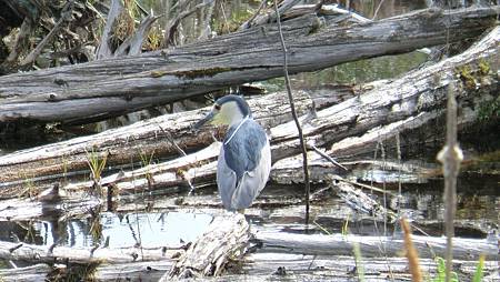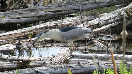 夜鷺(Night Heron)在台灣很普遍,這兒有,但少見,或許與牠喜活動於晨昏夜晚有關!日前(06/25)見一隻正在覓食(沒見牠逮著小魚),頭上那根隨風擺動白羽,身上的層次藍灰,細看都是美!