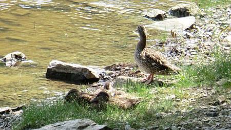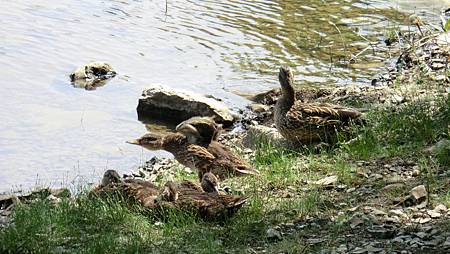 正奇怪這隻母鴨怎麼見到了人,不依慣例趕緊下水游開,且聽到歌聲也一動不動,原來是守著四隻午睡的小鴨仔們!雖說是鴨仔,但體型已蠻大,惟雙翅尚短小,仍需母鴨照管,然一入水,倒也是個游泳健將!