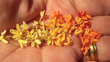 去年九、十月在南京、成都等地,見到不少桂花,才知桂花原來有四種:金桂(黃)、銀桂(偏白)、丹桂(橘紅)、四季桂(淺黃)等,除了未見銀桂外,其餘三種倒是常見,每每先聞香才尋花;兩種黃,單獨看不易分,放一起則較好辨識!