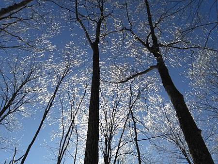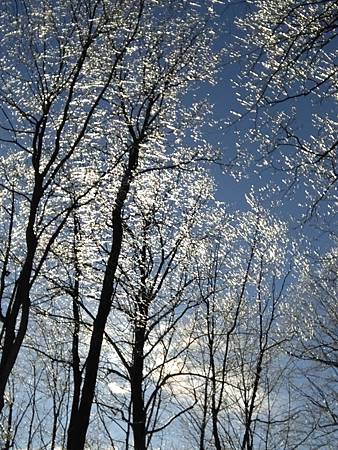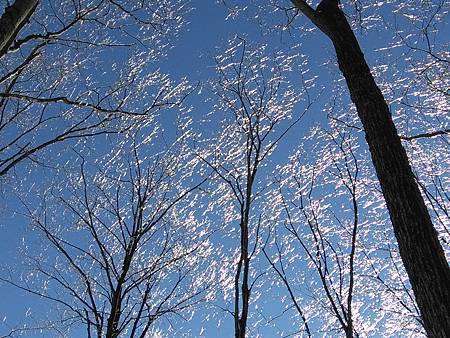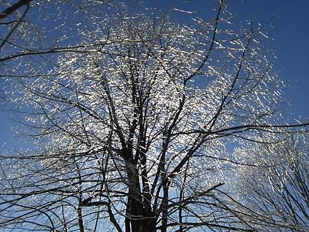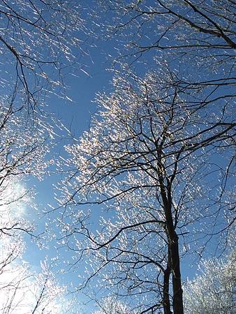 然看那裹著薄冰的樹枝,隨著陽光的時隱時現,時忱靜迷濛,時晶瑩閃耀,似在招呼著大地兒女!至終還是套上釘鞋套去了樹林,果不然,誠如所應許的,是一種落淚感動的美!