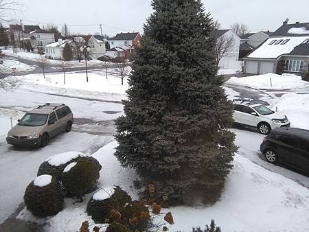 另一次(02/21)的冰雨後,早起往窗外一瞧,哈!老王的車和隔壁家的一輛白車,因地上凍冰,都快滑到街上去了!隔壁那輛黑車大概地面冰少,还隱如泰山!哈!北國特色!