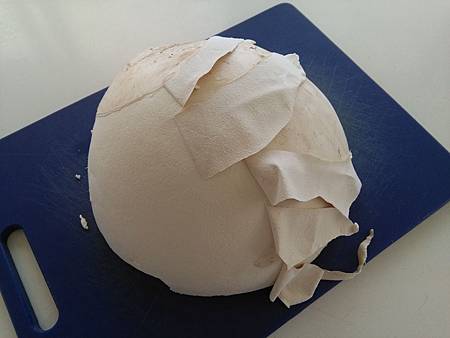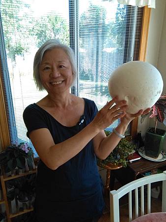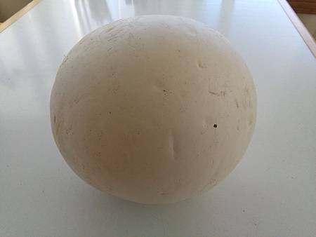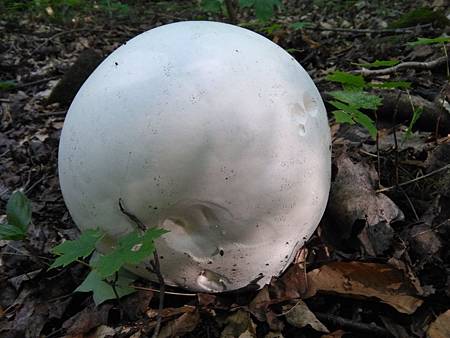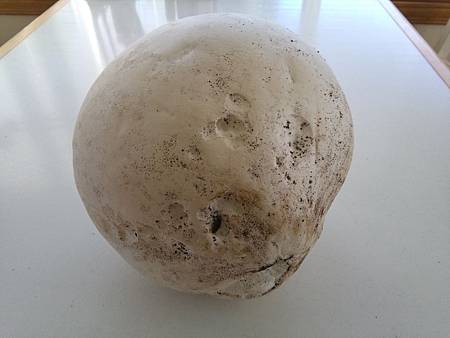 知道林中有Giant puffball(巨型馬勃菇),見過兩次尚未長成大型的幼菇,時不時的總想能見一次大型的!日前(08/26),居然一眨眼,離路徑不遠處,躺著一大白球,知道終於等到它了,哈!輕輕摘下,拎著它一路笑回家!