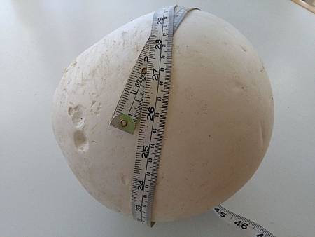 趕緊量量留下記錄,圓周25.5吋(64公分),2.5磅重,拍起來,像西瓜般梆梆響!