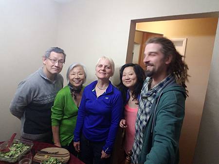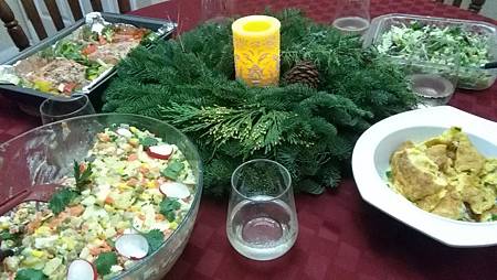 親家母Anna12/23從多倫多也飛來團聚,12/24我們的簡單晚餐,Anna做波蘭式沙拉,我做烤鮭魚,老王炒蛋,紋紋拌了另一道綠色沙拉!