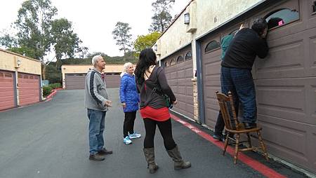 那兒的社區住宅設計是一排車庫,一排住房,一午紋紋没當心,車停進庫後,把車庫開關搖控器忘在車裏,轉身按門邊離開的關門鍵!導致無法再開車庫門,結果只見一群人,老爺、女婿、女兒、Anna都努力地在設法勾開一條可重新設定開門的引線,一鄰居看到也來幫忙,至終還是Anna成功完成的!大夥鬆了一口氣!否則節期間找人處理可貴啦!