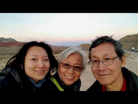 下飛機拿到租車(Nissan Infinity)後,直奔Red Rock Canyon,那是一個 1.8億年前(侏儸紀)曾被海水覆蓋,水退地動後,地質隆起,沙丘(sand dunes)演變成砂岩(Aztec Sandstone) 的公園,公園告示牌稱它為Sand Dunes Frozen in Time,紅色黃色的岩石紋路美麗奇異,範圍雖不大,景緻確十分特殊,眼光不停地被它的色彩震盪,不由想,美加有那麼多的地方都尚未走遊,反而猛往大陸東亞跑,除了自己是中國人外,那兒旅遊便宜也是主要原因!可惜時間緊,無法深入走步道,只能延觀景路徑停觀景台區,慢駛一圈送餘暉!賞心悅目的一程!