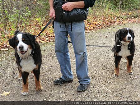 另一回在樹林中,遇見一人牽了兩隻伯恩山犬(Bernese Mountain Dog),一公(Steve, 100多磅)一母(Liesie, 80多磅),很有意思,說每天要溜兩次,每次十公里,主人真是超有愛心!記得在台北的某公寓大樓裏,曾看過一張昭示寫著:除非真愛狗,否則別養狗!真是有道理!