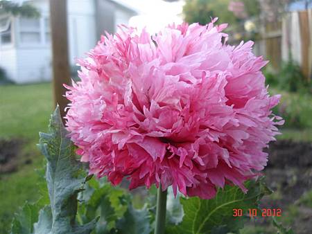她家的複瓣罌粟花,飯碗口大,四呎來高,真是美麗!